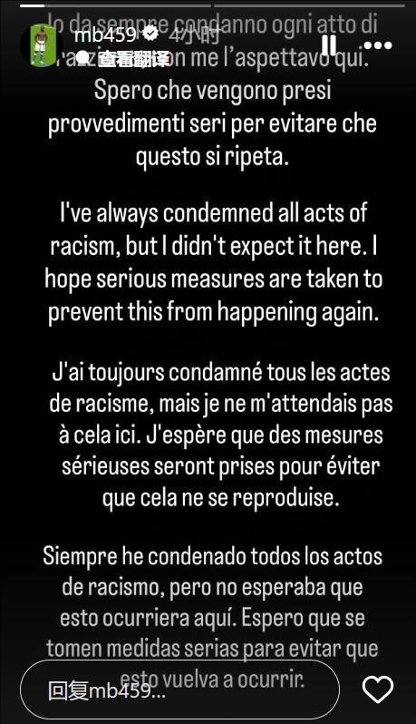 巴洛特利写说念:“我一向训斥任何体式的种族观点手脚,我没指望在这里会遇到这种事。我但愿探讨部门能选择严肃次序。今天在比赛中,我屡次遭受种族脑怒。对方反复对我喊:‘呜呜呜,去吃香蕉吧。’足球或社会中毫不应有种族观点的容身之地开云sports,这种手脚弗成被视为浮浅,也不秉承任何借口或被无视。我公开评论此事是为了让群众意志到问题的严重性。这不仅关乎我个东说念主,也关乎每一位受害者。当今够了,‘Enoughisenough’。”