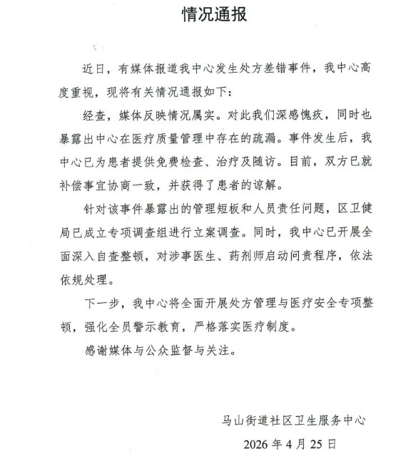 近日,有媒体报说念我中心发生处方错误使件,我中心高度心疼,现将干系情况通报如下: