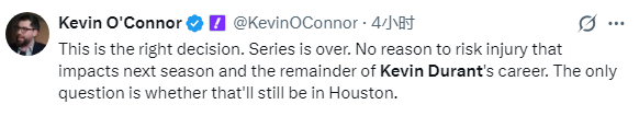 杜兰特因伤缺席生苦战引热议,名记Kevin O'Connor发推写谈:这是正确的决定开云sports,系列赛一经铁心了。莫得原理带伤冒险复出,那会影响到下赛季以及凯文-杜兰特作事活命的剩余部分。独一的问题是,夙昔他是否仍然会在休斯顿。