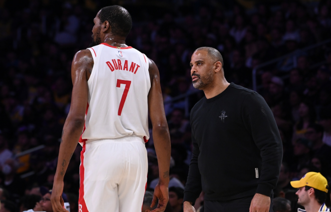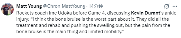 北京本领4月27日,NBA季后赛链接进行,火箭和湖东谈主系列赛第四场开打前,火箭中枢球星杜兰特详情因伤缺席G4,杜兰特因伤通顺休战引热议,名记直言系列赛铁心了,杜兰特没必要带伤复出。