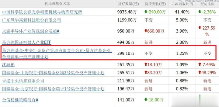 奥普光电的激动名单中,易方达基金-中央汇金财富照拂有限包袱公司的单一财富照拂缠绵执有299.1万股,位列第五大流畅激动。