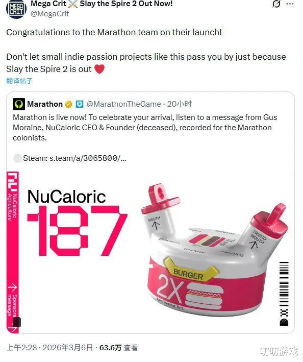 《夷戮尖塔2》开发商Mega Crit发推辱弄称,不要因为《夷戮尖塔2》太好玩,就错过《马拉松》这么的袖珍孤苦关心面孔哦!