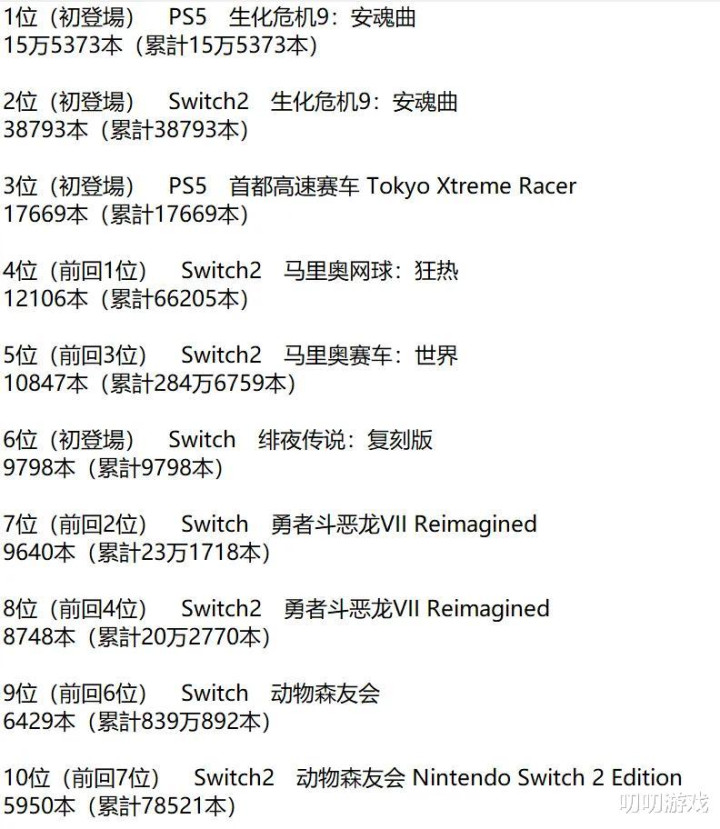 在2月23日至3月1日的新一周Fami通销量榜上,《生化危境9》PS5和NS2双版块以20万的销量,抢占销量榜冠亚军。