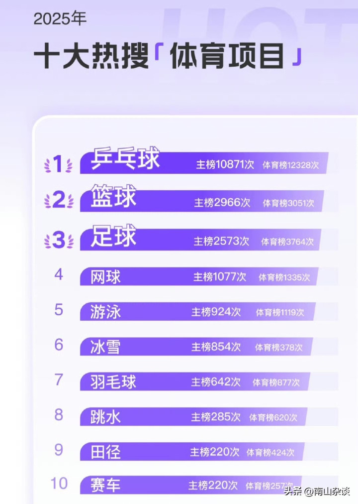先来看榜单,乒乓球断层最初排名第一,后九名加起来齐不如乒乓球多。天然了,乒乓球是咱们的国球,何况孙颖莎、陈梦、樊振东、王楚钦等东谈主,领有大齐量的粉丝,热度高亦然应该的。