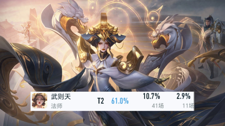 登场率10.7%,但胜率达到了61%,若是以40场次为领域,那么武则天的胜率等于第一了。