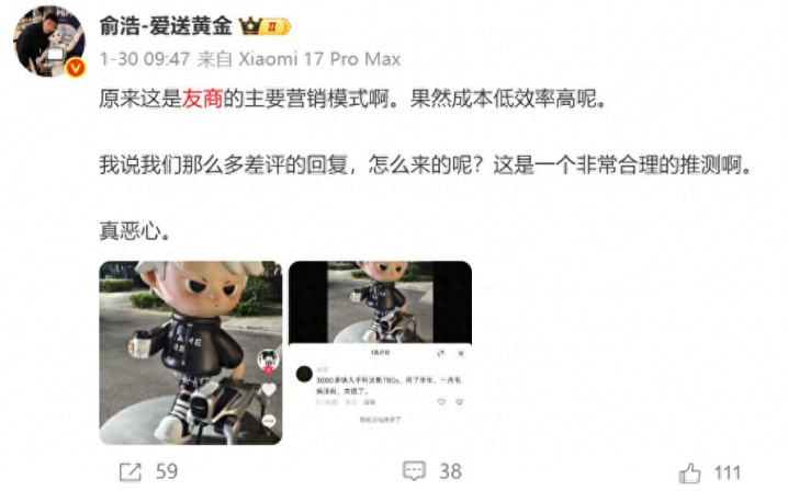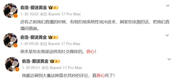 俞浩越说越气,发完以为还不够,后续还连发多条本体吐槽,连着说好几句“真恶心”。