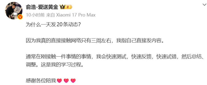 过去他给东谈主的印象即是一个低调的独创东谈主,可刻下却专心询查起了互联网流量,多的时候以至能一天发20多条动态。