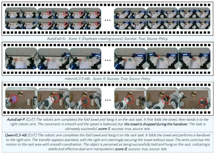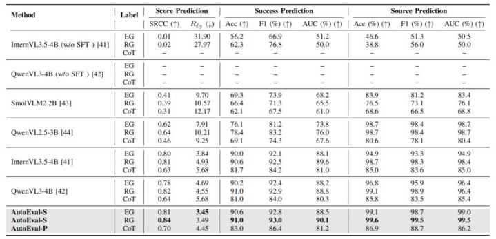 表格 2 Eval-Actions 基准上的性能对比 在内行评分(EG)、排序交流(RG)及念念维链(CoT)三种条约下,AutoEval 均得到了 SOTA 性能。相等是在 RG 条约下,AutoEval-S 的评分关系性(SRCC)达到 0.84,着手预计准确率高达 99.6%,远超未微调的 InternVL 和 QwenVL 等基线模子。
