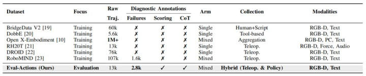 表格 1 机器东谈主操作数据集的对比分析。与以模子进修持中枢、追求原始轨迹数据量最大化的数据集不同,Eval-Actions 以标注密度最大化为联想主见,特有的上风在于提供故障场景数据、羼杂轨迹数据源。