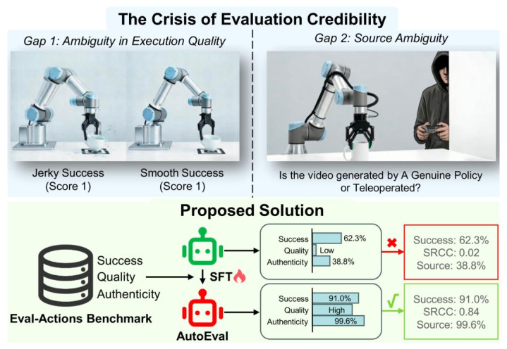 图 1 (上) 评估危境:现存二元目的笼罩了推论质地(如「抖动告成」与「平滑告成」的区别)和着手真实性(难以永诀计营生成与东谈主类遥操作)的否认性。 (下) 措置决策:Eval-Actions 基准与 AutoEval 架构(绿色部分)相联结,填补了这两大空缺,已矣了精确的细粒度质地评估与鲁棒的着手考证,显贵优于传统的通用 VLM(红色部分)。