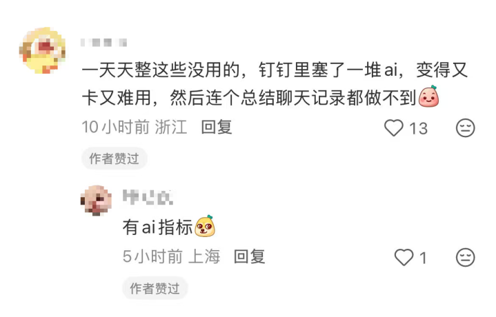 一位来自浙江的网友褒贬到:“钉钉里塞了一堆ai,变得又卡又难用,然后连个总结聊天记载都作念不到。”