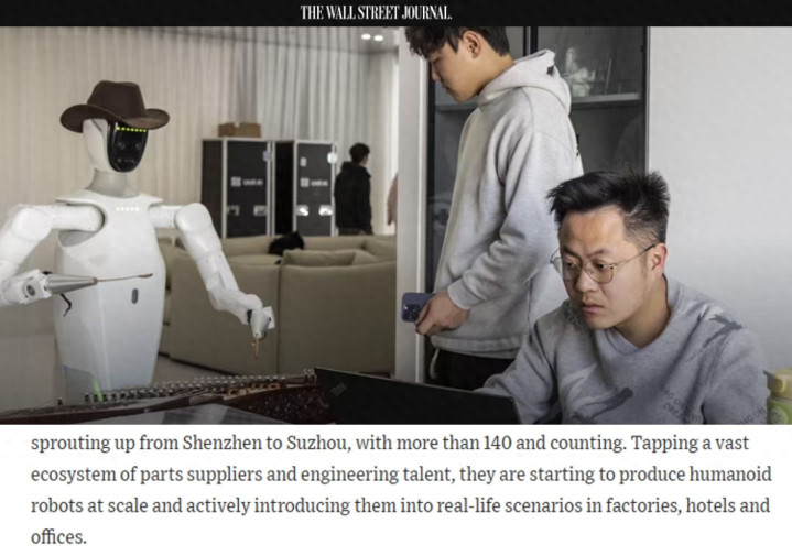 好意思国《华尔街日报》网站近日刊文称,中国机器东说念主产业正答应发展。从深圳到苏州,东说念主形机器东说念主企业如连车平斗般自满,当今已有逾越140家且数目仍在合手续增多。依托雄壮的零部件供应链和工程师东说念主才储备,这些企业已运行大规模分娩东说念主形机器东说念主,并积极将其引入工场、旅店及办公情势等实际场景进行期骗。