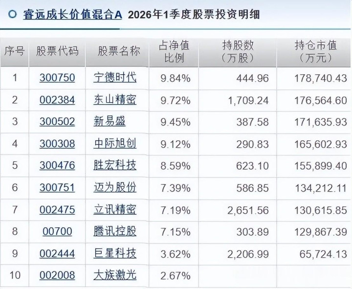 新易盛由9.5%减至9.45%,小幅减仓,从第一重仓滑落至第三;胜宏科技从9.38%减至8.59%,腾讯控股从8.64%减至7.15%;立讯精密从7.31%减至7.19%,这些属于小幅微调。