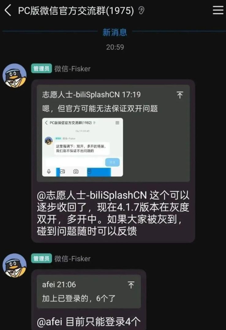 左证网崇高传出的一张截图来看,在 PC 端微信官方调换群中有东说念主发现,Windows 微信 4.1.7 版块正在灰度测试多开功能。