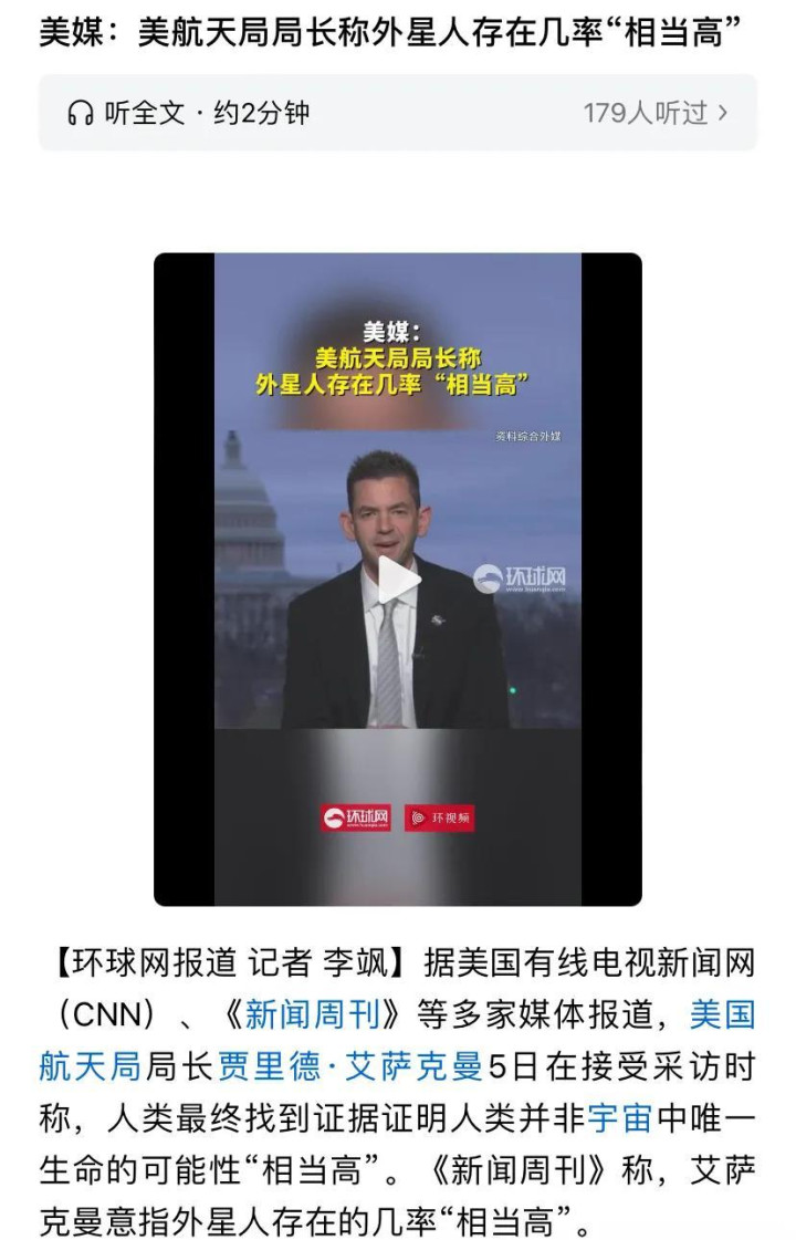 据了解,好意思国当地技术2026年4月5日,好意思国航天局局长贾里德·艾萨克曼在罗致采访时称“东说念主类最终会找到东说念主类并非天地惟一人命存在的左证可能性特别高”,有媒体称艾萨克曼所指的是除东说念主类之外的外星东说念主,这代表外星东说念主存在的几率“特别高”。不知说念他是有干系左证,照旧说东说念主类会找到,然则当今还有干系左证。
