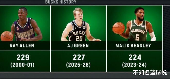 其四,格林本赛季227记三分升至雄鹿队史第二位。