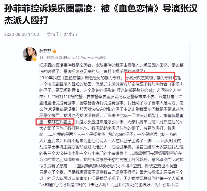 2023年8月,演员孙菲菲用一则长文揭露了文娱圈的恐怖“内幕”。