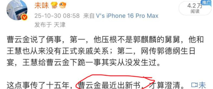 不外也有网友认为,曹云金的服软,应该不是丹心念念总结,仅仅为了博取流量。如今他深耕直播界限,2025年还推出新书,反复说起与郭德纲的恩仇,骨子可能是念念为我方引流。