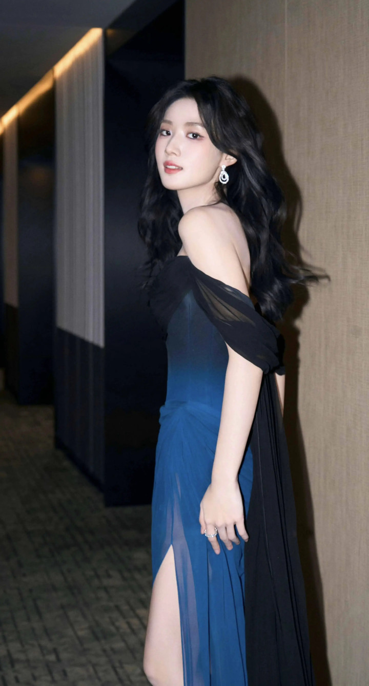 开云sports 卢昱晓|黑蓝渐变抹胸纱裙,好意思到发光!