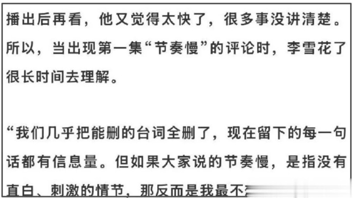 在扑街已成既定事实的情况下,导演李雪领受了采访。关于作品热度不够爆,不雅众反应剧集节拍慢等争议,李雪也给出了回报,他示意平台曾说过节拍慢的问题,他也因此改革了第一集的裁剪,把刺激性的镜头放在了第一集末尾。