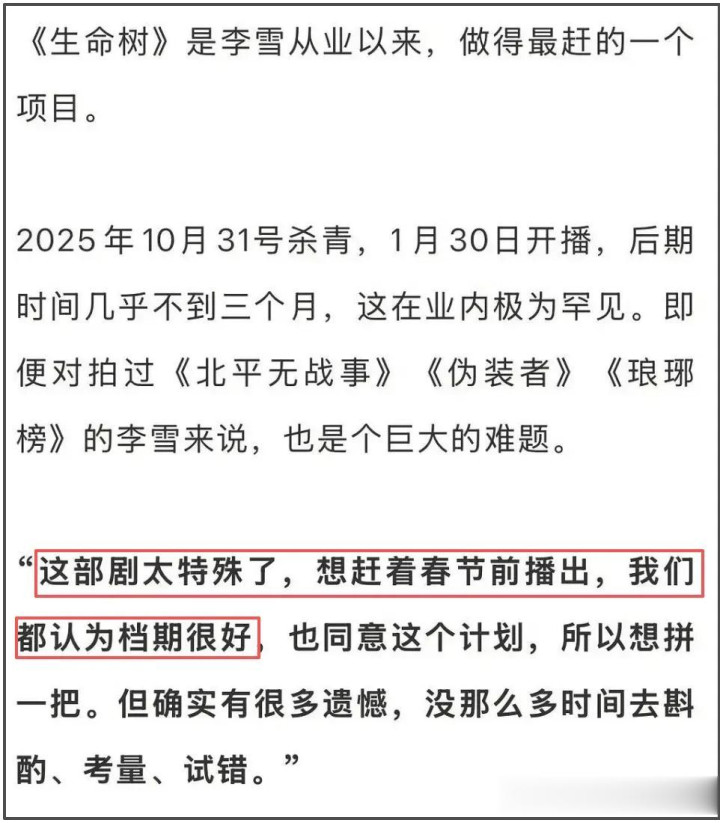 退一万步讲,惟有作品性量好,不雅众不在乎是哪个档期播出。是导演认为春节档很好,播出之后还能赶上本年各大奖项的评奖期,是以紧赶慢赶、哪怕作品性量方面有缺憾也不进犯。但是,不雅众作念错了什么,要为错误偷安的实际买单。