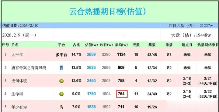 比起收视率,更惨的是网播收获。从某博主分析的云合热播期日榜估值表中不错看到,《人命树》网播占比不到10%,位列第四名。重心是,也曾播出过半但集均播放量果然还不到800万,网播扑街得极端透澈。