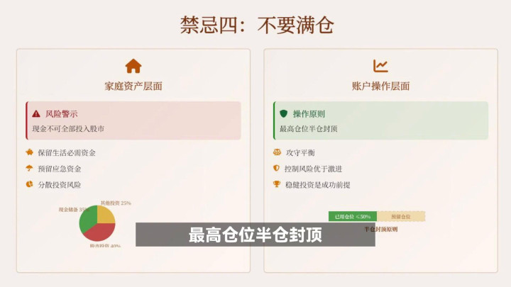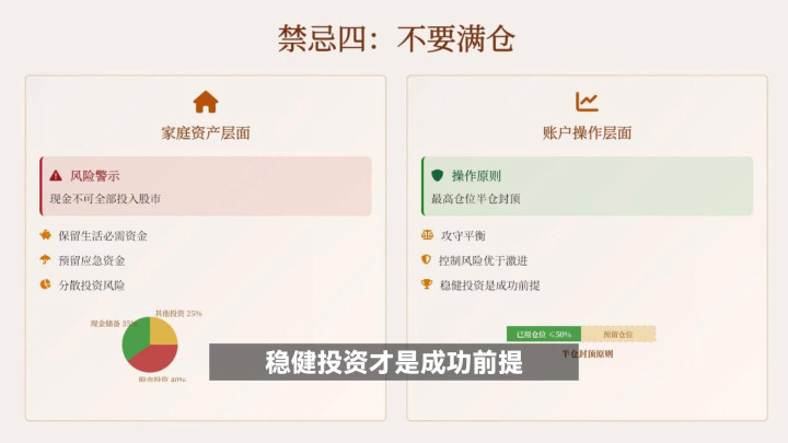 ·炒股禁忌四:不要满仓。家庭财富层面,现款勿全投股市,开云sports要留生涯必需和救急资金,散播投资风险。账户操作上,最高仓位半仓封顶,攻守均衡,秩序风险优先,庄重投资才是得胜前提。
