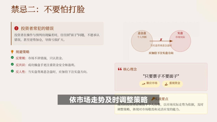 ·禁忌一:不要怕踏空。反共鸣:大无数东说念主王人发怵踏空,但果真的风险在于"怕"。怕踏空致套牢或大亏,号称炒股癌症,实质是"妄念"。盲目追高、连续往还,易激发此类问题。藏匿需反旧例,显豁钱赚不完但本金会亏完。反共鸣:认清怕踏空才是真风险。反东说念主性:废除收拢扫数契机的执念,承袭错过契机是常态。