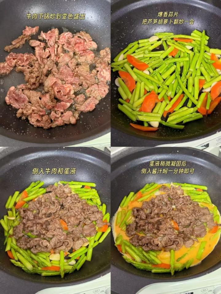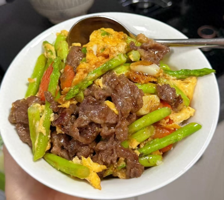 芦笋脆嫩清甜,满满的膳食纤维,牛肉鲜活不腻,少油快炒,减脂期也能吃得很香。